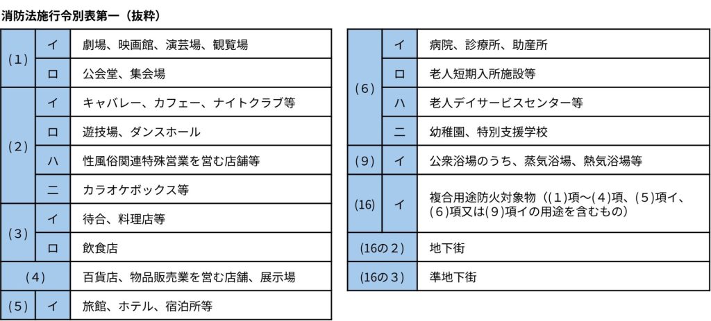 ※消防法施行令別表第一(1)項から(4)項まで、(5)項イ、(6)項、(9)項イ、(16)項イ、(16の2)項及び(16の3)項に掲げる防火対象物